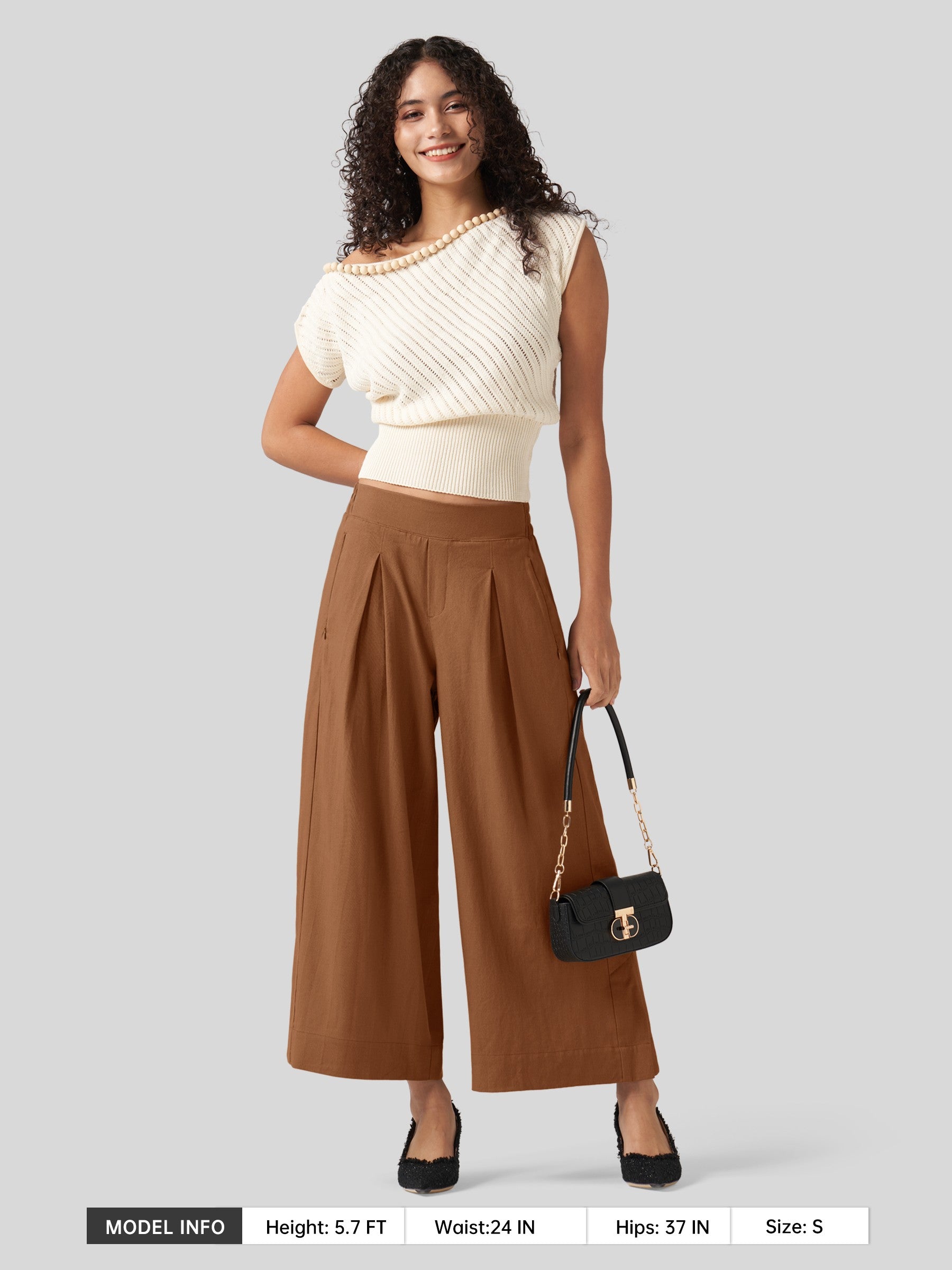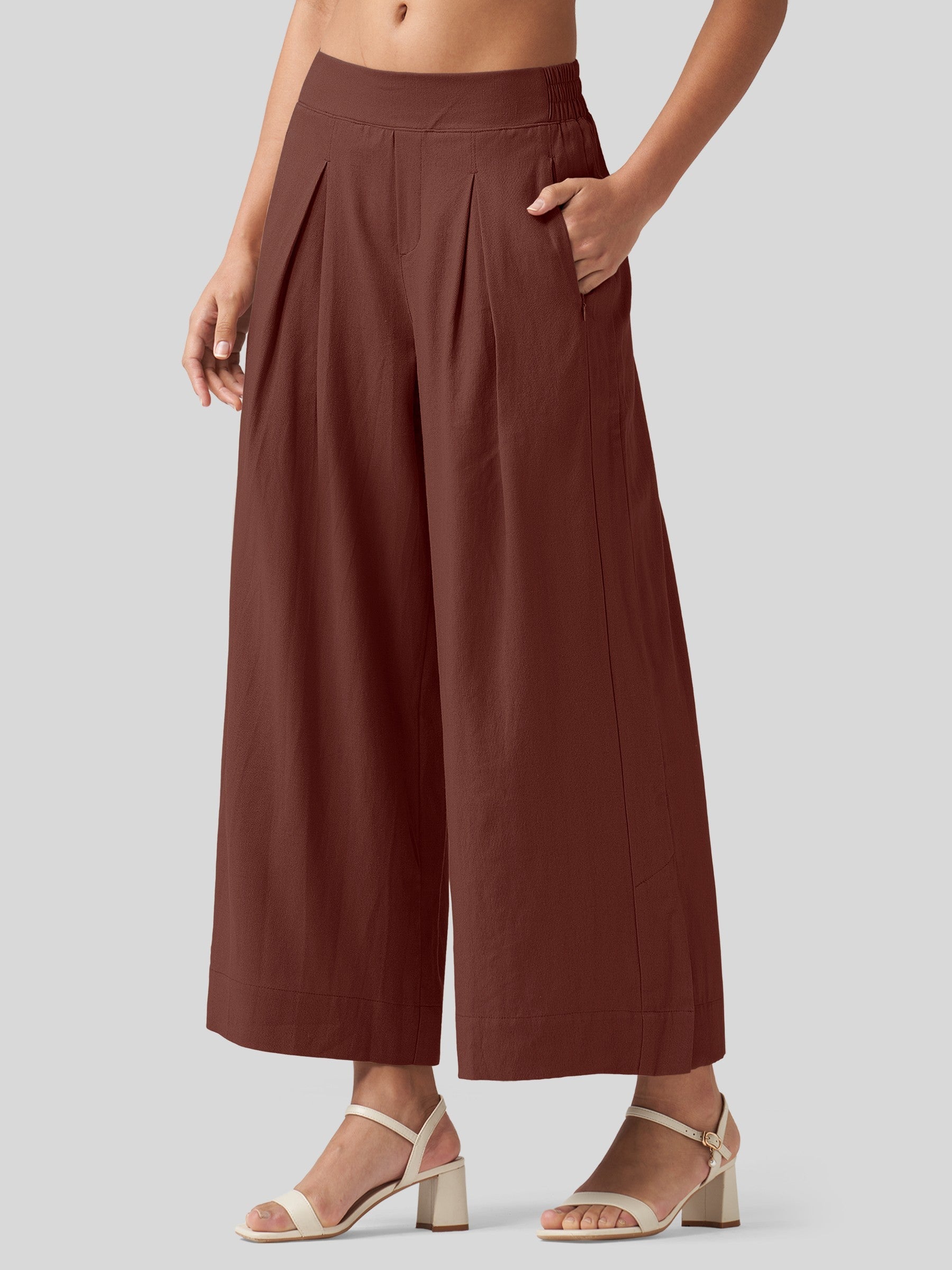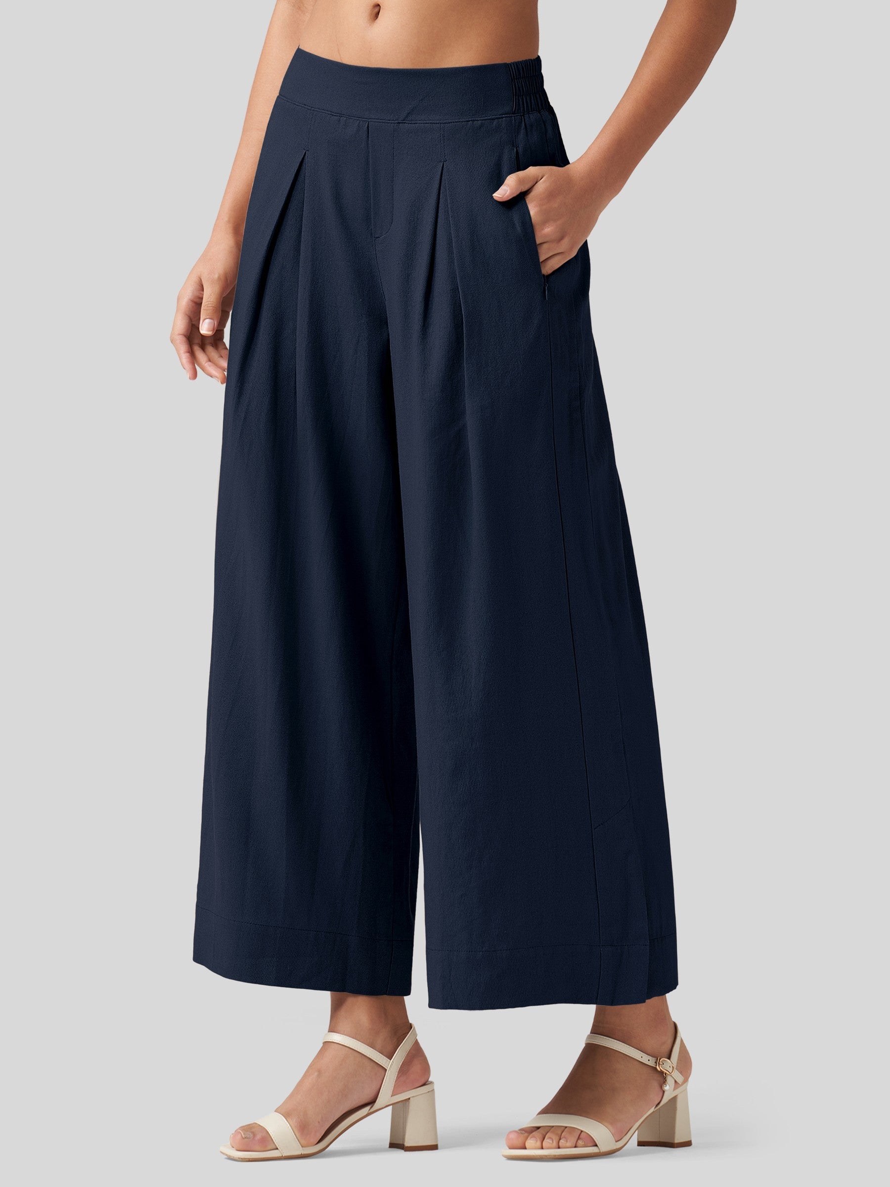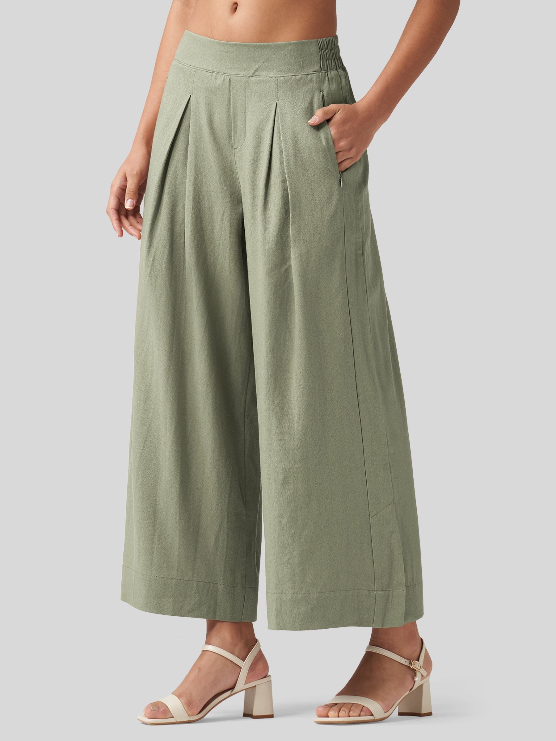 - Designed with a mid-waisted fit and elastic back waist, it features front pleats that add a touch of modern flair. The roomy, wide-leg cut flatters every body type, beautifully sculpting your curves